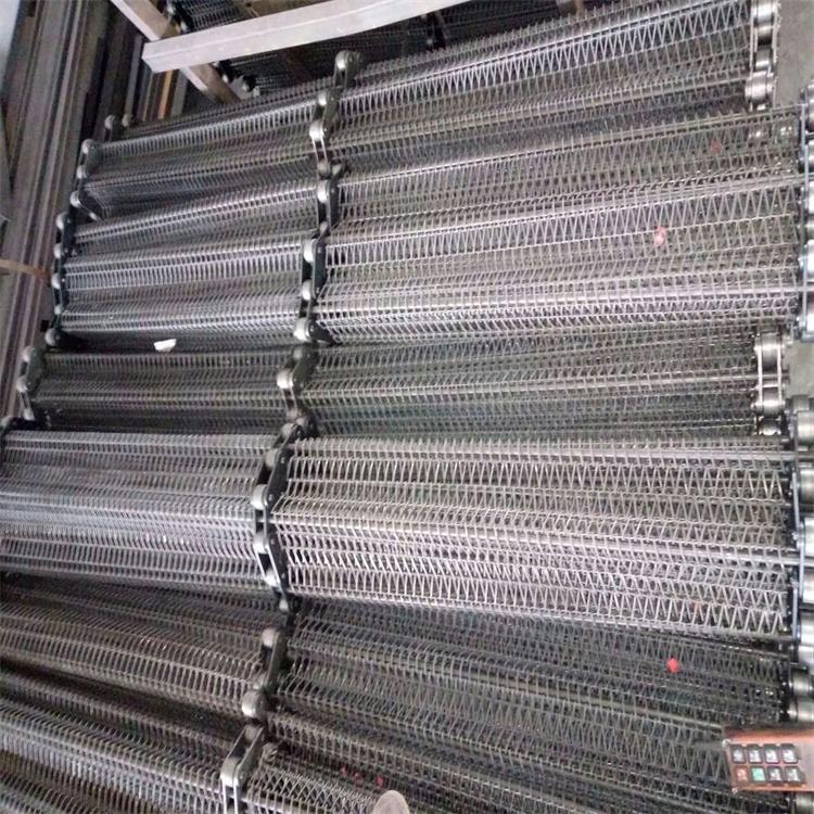 鏈條式網帶由一般的輸送網帶兩側加裝鏈條及橫向支撐桿而成,鏈輪傳動,網帶寬帶固定不變形。調整網帶不同的節距,即可安裝不同形式的鏈條,容易安裝網帶的附屬配件,如擋板,側翼。。。。。網面平整,可承載較重的壓力和拉力,通風透氣性能好,節能環保,網面潔凈無毒,而且容易清洗,維修和拆卸極為方便,鏈條式網帶被廣泛用于食品速凍,蔬菜除沙,清洗殺菌,殺菌預煮,烘烤,干燥,電子行業生產線。