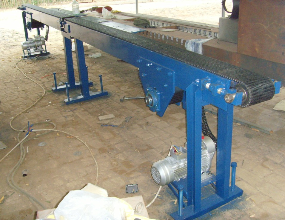 兩臺制瓶機生產的玻璃制品及時,穩定的送往退火爐。該機采用齒形鏈式輸送帶,要求穩定,不跑偏,不打滑,使用壽命長