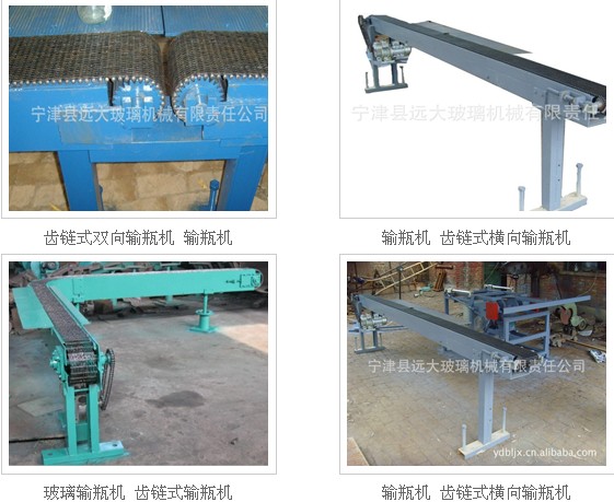 在玻璃制品生產中,用作退火爐、推瓶機玻璃制品的橫向輸送,本機采用了齒鏈帶,在運轉中平穩、可靠、壽命長,各部調整簡單、方便。