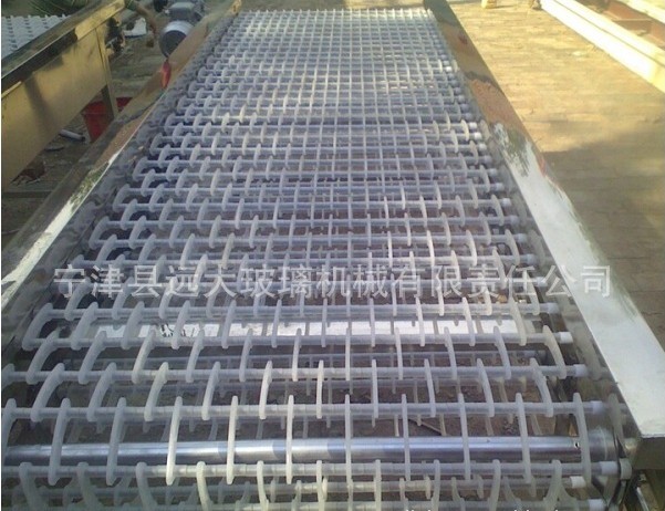 2,輸送機的輸送帶是不銹鋼304的人字形的鏈網輸送帶,絲徑是1.5毫米的,三根穿的,輸送帶的鏈桿是