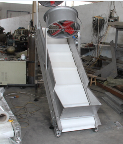 帶軸流風扇的皮帶輸送機  帶式輸送設備 。在輸送帶溫度的物件時,需要降溫,達到客戶需要的降溫效果,就在輸送機上面加上風扇,數量定做,皮帶輸送機能制造成提升的形式進行輸送工作,提升的角度也是定做的。