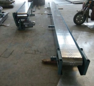 鏈板輸送機:又叫鏈板傳送機,鏈板線,鏈板傳送帶。是一種利用循環往復的鏈條作為牽引動力,以金屬板作為輸送承載體的一種輸送機械設備。國內市場上有兩種鏈板輸送機,一種是用鏈條,支軸和金屬板組成的輸送鏈板做成的輸送機;一種是用帶彎板的鏈條和金屬板組成的金屬板輸送帶做成的鏈板輸送機,另一種是平頂鏈鏈板輸送機。