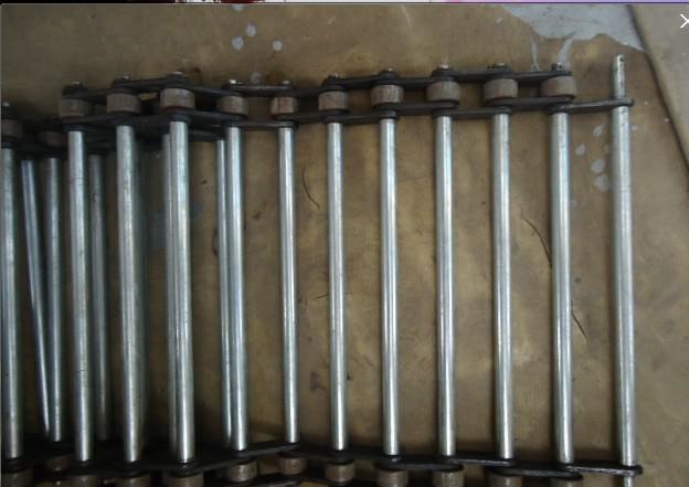 這是一種利用鏈條和支軸做成的傳送輸送帶。先把支軸穿軸的兩頭車細,然后兩邊鑲上鏈條,最后用墊圈把支軸焊上或用開口銷銷上,這就是鏈桿式輸送帶。鏈條的節距和材質和滾子的大小各種都有,支軸的粗細和材質和直徑和長度有多種型號供選擇。
