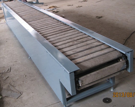 鏈板輸送機:又叫鏈板傳送機,鏈板線,鏈板傳送帶。是一種利用循環(huán)往復(fù)的鏈條作為牽引動力,以金屬板作為輸送承載體的一種輸送機械設(shè)備。國內(nèi)市場上有兩種鏈板輸送機,一種是用鏈條,支軸和金屬板組成的輸送鏈板做成的輸送機;一種是用帶彎板的鏈條和金屬板組成的金屬板輸送帶做成的鏈板輸送機,另一種是平頂鏈鏈板輸送機。