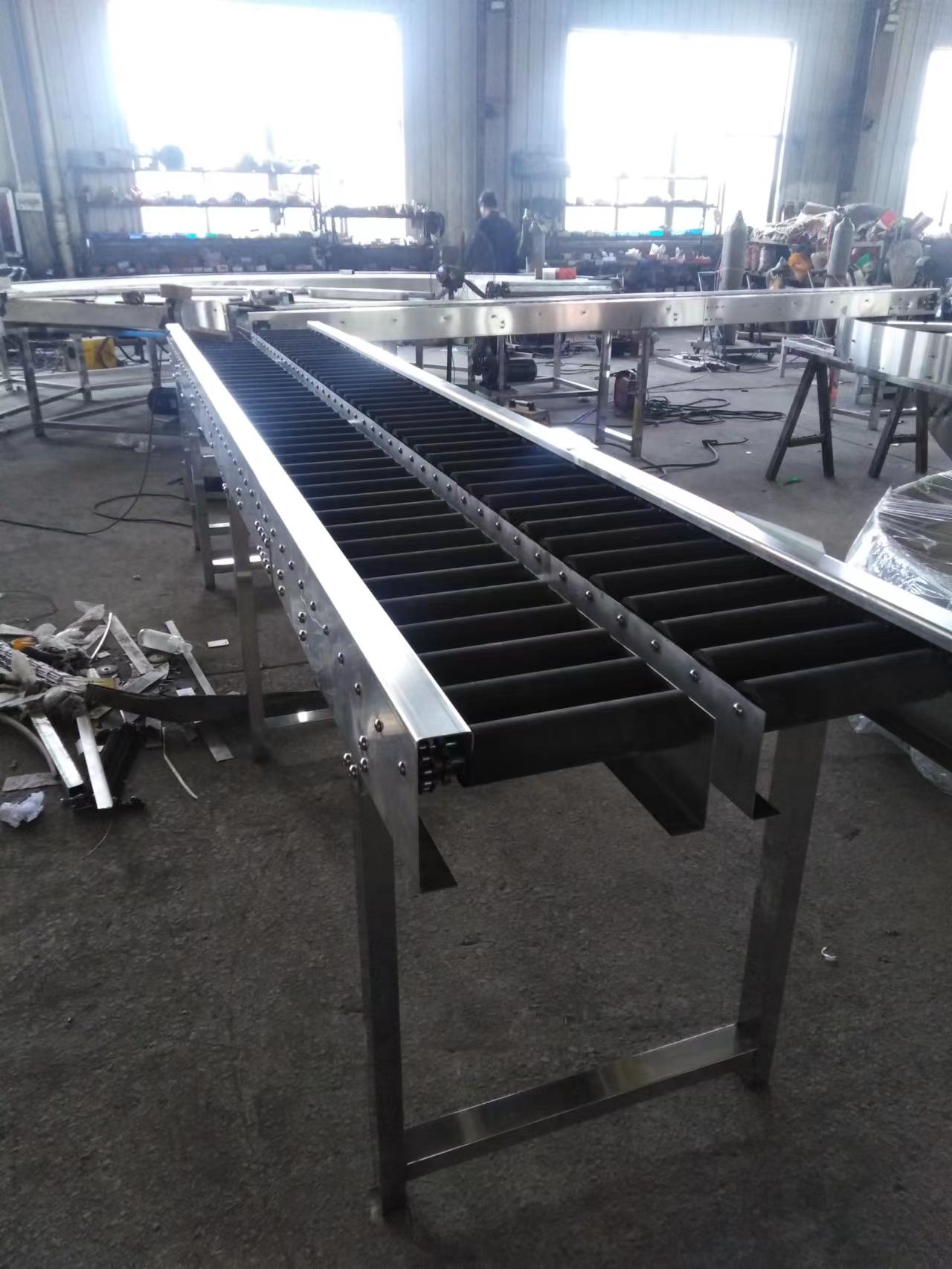 滾筒輸送機適用于各類箱、包、托盤等件貨的輸送,散料、小件物品或不規則的物品需放在托盤上或周轉箱內輸送。能夠輸送單件重量很大的物料,或承受較大的沖擊載荷,滾筒線之間易于銜接過渡,可用多條滾筒線及其它輸送機或專機組成復雜的物流輸送系統,完成多方面的工藝需要。可采用積放滾筒實現物料的堆積輸送。滾筒輸送機結構簡單,可靠性高,使用維護方便。滾筒輸送機適用于底部是平面的物品輸送,主要由傳動滾筒、機架、支架、驅動部等部分組成。具有輸送量大,速度快,運轉輕快,能夠實現多品種共線分流輸送的特點。滾筒輸送機結構形式:按驅動方式可分為動力滾筒線和無動力滾筒線,按布置形式可分為水平輸送滾筒線、傾斜輸送滾筒 線和轉彎滾筒線。還可按客戶要求特殊設計,以滿足各類客戶的要求。標準規滾筒線內寬度為200、300、400、500、1200mm等。也可按客戶需求采用其它特殊規格。轉彎滾筒線標準轉彎內半徑為600、900、1200mm等,也可按客戶需求采用其它特殊規格。直段滾筒所用的滾筒直徑有38、50、 60、76、89mm  滾輸送機的注意事項 :第一:物品在輸送的任何時間點,物品底部都必須有最少有三根滾與物品底部接觸  第二:滾筒輸送機先空載啟動,運行正常在放物料,停止放物料,再停機。